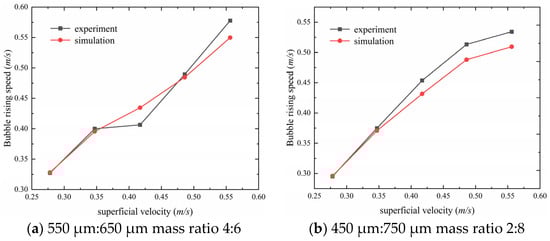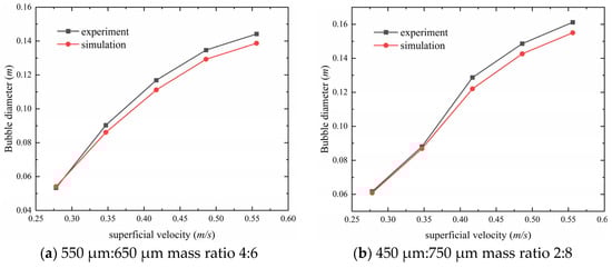 29]. The model uses a homogenized computational grid with 5376 grids; the bed is filled by a mass generation with a filling rate of 0.02 kg/s; the two types of particles are packed according to a mass ratio of 1:1 and the total number of particles is 20,100. The Gidaspow model was chosen for the particle trailing force model and