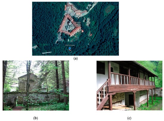 Figure 1. The Rila Monastery and the Church-Ossuary: (a) an air view of the Rila Monastery complex with the location of the Church-Ossuary marked by a red circle; (b) a general view of the Church-Ossuary building, east facade; (c) the ossuary and the church upstairs, west facade.
