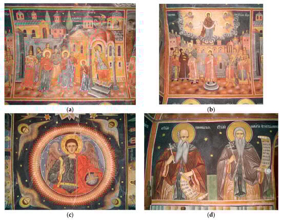 Figure 2. Selected scenes from the wall paintings of the Church-Ossuary of the Rila Monastery: (a) Churchyard Presentation of the Blessed Virgin; (b) The Protecting Veil of the Blessed Virgin; (c) Christ the Angel of the Great Council; (d) Saint Paphnutius and Saint Macarius of Egypt.