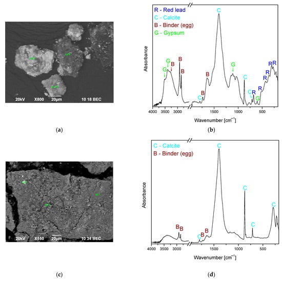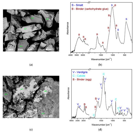 Figure 4. Backscattered electron images of the blue (a) and green (c) samples from the background; ATR–FTIR spectra of the blue (b) and green (d) samples from the background.