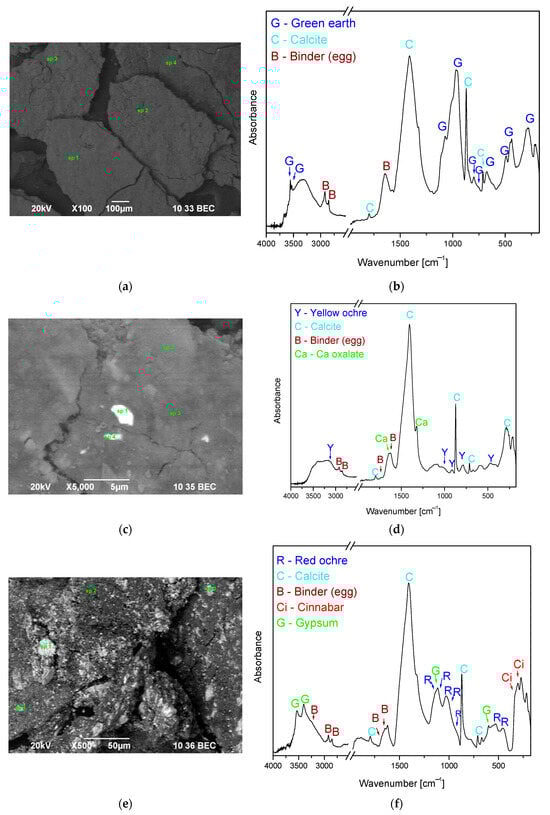 The identification and analysis of art materials used in mural creation is essential for the preparation and determination of the most appropriate strategy for murals’ restoration and conservation and to optimize the conditions for storing them. Vibrational spectroscopy is a commonly used method for art materials analysis as it can give general information about both the mineral and organic materials, including mortars, pigments, and binders in the painting materials. Since many of the minerals commonly used as red, orange, and yellow pigments are heavy metal oxides, sulfides, and hydroxides—for instance, red lead, hematite (present in red ochres), goethite and limonite (present in red and yellow ochres), cinnabar, massicot, and others—they absorb IR radiation in the spectral interval below 500 cm−1. Therefore, the far IR analysis is particularly useful for the identification of these pigments [7]. Over the past few decades, there have been numerous publications in which the capabilities of vibrational spectroscopy have been employed in the investigation of a variety of mural paintings [7,8,9,10,11]. Unfortunately, due to the complex nature of painting materials (present in the wall paintings), in many cases their identification based solely on the vibrational spectra is challenging. This is because the characteristic bands of different components in the multicomponent mixtures frequently overlap, making it difficult to distinguish between them. For this reason, a combination of the vibrational study with SEM–EDS analysis is applied as a complementary method for the identification of the pigments in painting layers [12,13,14,15]. The identification of organic materials (binders) within paint samples is a more difficult task due to the typical smaller quantities of the organic materials compared to the inorganic ones (pigments and mortar). Furthermore, the deterioration processes that occur over time may further reduce the quantities of these organic materials. For the reliable and complete analysis of the binder, the spectral methods are usually combined with chromatography-/mass spectrometry-based techniques (GC/MS, Py-GC/MS, HPLC) [16,17,18,19,20,21], as well as enzyme-linked immunosorbent assay (ELISA) [22,23,24,25,26,27,28]. The latter technique is a highly specific and sensitive method for identification of proteins even in trace amounts.