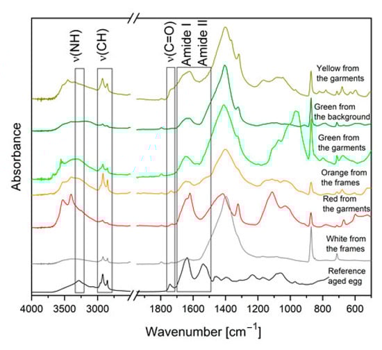 Our IR analysis showed that two of the paint samples (green and red from the garments) lacked a distinct lipid carbonyl stretching band, but in the other cases, the ATR–FTIR spectra contained a band at such a position, although it was of a weak intensity. The ATR–FTIR spectra of the samples are compared with the spectrum of the reference aged, dried egg in Figure 7. Where the lipid band is observed, the intensity ratio of the amide I and the lipid carbonyl stretching band corresponds to those characteristic for the whole egg (Figure S3 in the Supplementary Materials), which indicates that, most probably, the binder is whole egg.