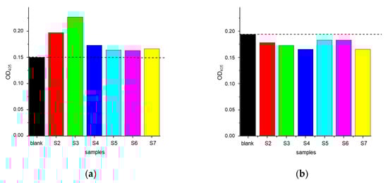 Figure 8. Detection of egg white (a) and casein (b) by the measurement of the optical density at 405 nm using ELISA at optimized antibody dilutions. Conditions for egg white detection: rabbit anti-chicken ovalbumin (primary antibody, 1:10,000) and goat anti-rabbit IgG alkaline phosphatase (secondary antibody, 1:2000). Conditions for casein detection: rabbit polyclonal antibody to casein (primary antibody, 1:500) and goat anti-rabbit IgG alkaline phosphatase (secondary antibody, 1:1500). The dashed line represents the assay cut-off value. For sample numbering, see Table 1.