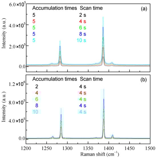 in which I is the measured Raman spectral intensity, K is the proportionality coefficient, N is the number of Raman-active molecules, σ is the Raman scattering cross-section, and IL is the incident laser intensity. From the equation, the measured Raman spectral intensity is influenced by both the number of Raman-active molecules present and the intensity of the incident light. Consequently, variations in measurement conditions, such as excitation source power, optical configuration, scanning time, and accumulation times (Figure 1), can affect the measured Raman intensity. This may be used to enhance the measured Raman spectral intensities. Additionally, this also indicates that the measured Raman intensity cannot be directly applied to quantitatively determine the molecular number.