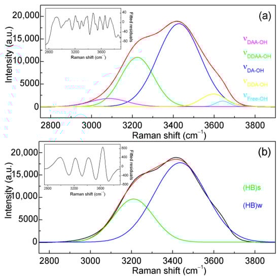 33. Sun, Q. The Raman OH stretching bands of liquid water. Vib. Spectrosc. 2009, 51, 213–217. [Google Scholar] [CrossRef]