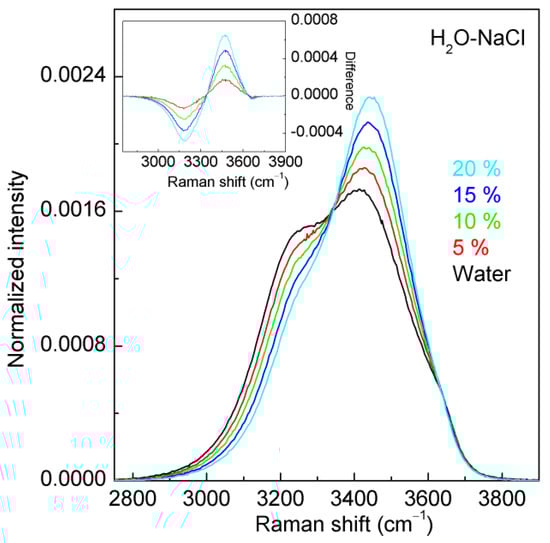 As NaCl salts are dissolved into water, they become the hydrated Na+ and Cl ions. Molecular dynamics (MD) simulations indicate hydration numbers of 5.67 and 7.31 for Na+ and Cl, respectively, at 0.5 M concentration. At 4 M concentration, these coordination numbers increase to 5.09 and 7.78, respectively [36]. The electrostatic interactions of Na+ and Cl with the unoccupied orbitals of surrounding water molecules undoubtedly alter the water structure, as evident in the spectral changes observed in the Raman OH stretching bands of water (Figure 3).