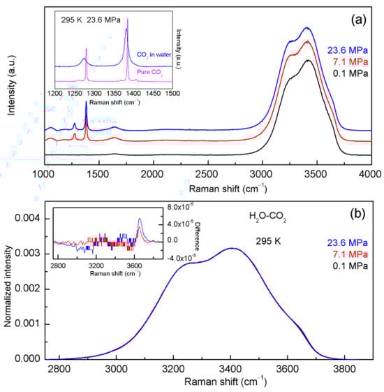 Figure 5. (a) The Raman spectra of the H2O-CO2 system. (b) The normalized intensity of the Raman OH stretching band of the H2O-CO2 system. In comparison with pure water, only slight changes can be found in the normalized intensity difference between the H2O-CO2 system and pure water, which are shown in the inlet.
