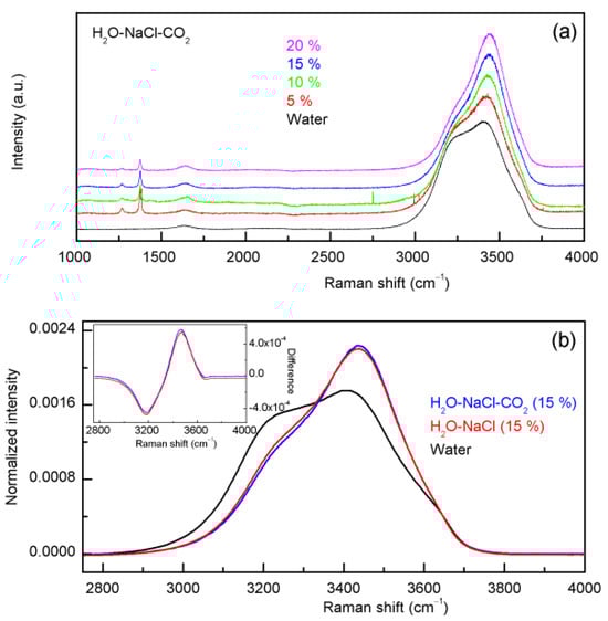 Figure 6. (a) The Raman spectra of the H2O-NaCl-CO2 system. (b) Only slight changes are observed in the normalized intensity difference between H2O-NaCl-CO2 and H2O-NaCl systems, which are shown in the inlet.