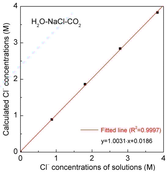The preceding discussion indicates that dissolved CO2 has a minimal impact on water structure. Compared to the effects of NaCl on Raman OH stretching bands, the effects of CO2 may be reasonably ignored. In other words, regarding the spectral changes in Raman OH stretching bands of the H2O-NaCl-CO2 system, it may be reasonably ascribed to the effects arising from dissolved Cl ions. Therefore, Equation (3) may be reasonably extended to determine the Cl concentrations in the H2O-CO2-NaCl system. After the Raman OH stretching bands are fitted into two sub-bands, the intensity ratio between them may be applied to calculate the Cl molarity of the H2O-NaCl-CO2 system (Table 2). It is observed that the computed findings closely approximate the Cl concentrations in the synthetic H2O-NaCl-CO2 system (Figure 7).