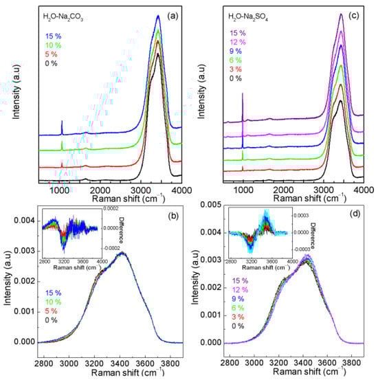 Figure 9. The normalized intensities of H2O-Na2CO3 (a,b) and H2O-Na2SO4 (c,d) systems. In comparison with pure water, obvious spectral changes are found for Na2CO3 (a,b) and Na2SO4 (c,d). Solution spectral changes are mostly associated with the interactions between Cl and water, as indicated by the structural analysis. The intensity ratio of the two fitted sub-bands can be utilized to determine the Cl concentrations in NaCl solutions.