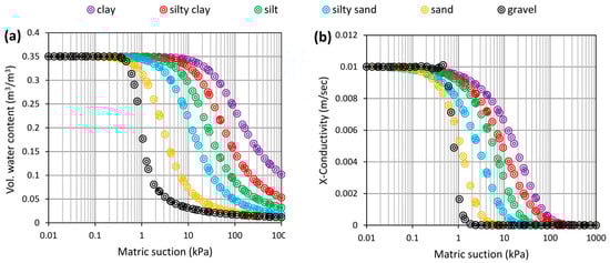 In order to investigate the effect of soil particle size on contaminate development, two-dimensional modeling was employed. In this model, six types of soil, including clay, silty clay, silt, silty sand, sand, and gravel, were utilized to represent varying particle sizes. Sample functions for different soil types were employed to estimate the volumetric water content and hydraulic conductivity functions within a saturated–unsaturated material model, covering a range of soils from clay to gravel. These sample functions were generated using the characteristic curve-fitting parameters outlined in Equation (10). Additionally, the volumetric water content function can be approximated through the modified Kovacs model proposed by Aubertin et al. (2003) []. Tabular data for volumetric water content and suction, whether sourced from the literature, derived from pedotransfer functions, or obtained through laboratory testing, can also be directly incorporated into the model for analysis. Figure 2 illustrates the assumptions regarding porosity and saturated hydraulic conductivity used in the analysis. The porosity was set at 0.35, while the saturated hydraulic conductivity was assigned a value of 0.01 m/day (1.16 × 10⁻⁷ m/s).