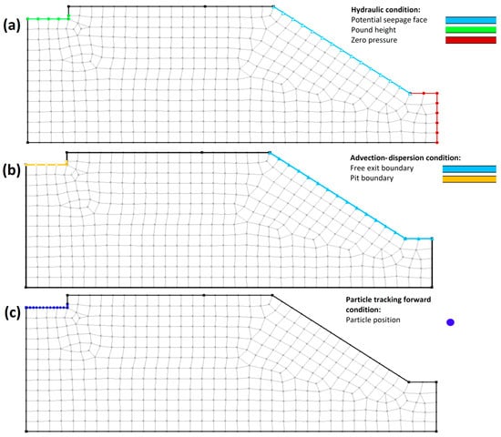 Model configuration with boundary conditions: (a) Hydraulic condition, (b) Advection-dispersion condition, and (c) Particle tracking forward condition.