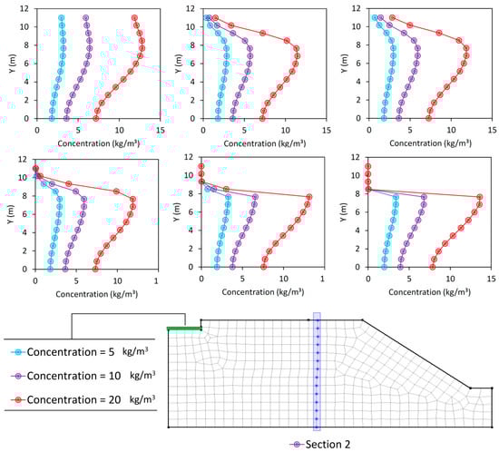 In order to examine the impact of soil particles on contaminate development, a pollution migration model was evaluated based on various soils, along with a concentration of 10 kg/m3. For this purpose, three cross-sectional sections were considered beneath the pit (Section 1), in the middle of the dam (Section 2), and at the end of the model (Section 3) to investigate contamination development. Figure 4 illustrates concentration plots based on these sections. As seen in Figures in Section 1 and Section 3, there are no significant variations in concentration based on soil particle sizes. This is entirely justifiable since these sections, being at the beginning and end, do not exhibit substantial changes.