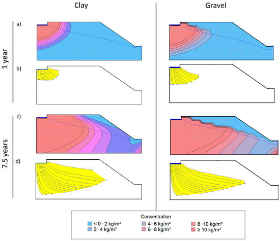 Figure 6b,d illustrate the concentration distribution for clay and gravel soils after approximately 1 and 7.5 years. In this context, mass can exit the domain through advection when water crosses the domain boundary. However, the natural boundary condition mandates that the concentration gradient perpendicular to the surface remains zero, which results in concentration contours being perpendicular to the exit boundary. The results indicate that concentration dispersion is more pronounced in clay than in gravel.