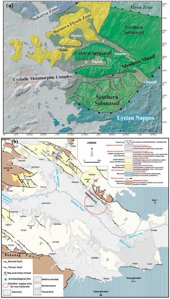 The archaeological site of Hierapolis (Denizli, Turkey), located in western Anatolia, was founded in the 3rd century BCE and, even if damaged several times by earthquakes [17,18,19], the city was inhabited and restored until the Mediaeval period. From a geological point of view, this area is characterized by the presence of metamorphic rocks associated with the alpine metamorphic dome of Menderes Massif [20,21,22,23,24]. From the Miocene to the present day, the continuing extensional tectonics has divided the Menderes Massif into three sub-massifs due to the formation of three large grabens: the Küçük Menderes, the Büyük Menderes and the Gediz (Figure 2a). These converge into the Denizli Graben, which lies on the south-eastern edge of the Menderes Massif and borders on the Lycian Nappe. The area is characterized by normal faulting to the southwest by the Babadağ main fault and to the northeast by the Pamukkale fault zone. This fault zone includes the world-famous terrace of Pamukkale [25,26,27,28], known for its white travertine waterfalls of calcareous deposits originated from thermal water, which gave the terrace its name (“Pamukkale” means “cotton castle”) [16]. The extensional tectonics of the Anatolian region is the main cause of the territory faulting and magmatic intrusions. This condition explains the heating of meteoric waters deeply entering the soil through fractures and faults, which cause the formation of numerous hydrothermal springs, with more or less high temperature [29,30]. The prolonged discharge of hot, CaCO3-rich fluids from faults, fissures and rock fractures have led to massive depositions of bedded and banded travertines, which have been extensively exploited over time [31]. These hydrothermal fluids are also involved in forming carbonate-cemented breccia produced by the cementation of sedimentary or metamorphic rock debris [32,33]. Marbles are abundant in the surroundings of Hierapolis, with ancient quarries located only a few kilometers from the city center. This rock type is linked to the metamorphic Menderes Massif [34,35], as well as the other metamorphic rocks outcropping in the Hierapolis area: quartzites, calc-schists, meta-sandstones, phyllites, schists, amphibolites and gneisses (Figure 2b). Within the Denizli basin, we can observe some allochthonous rock outcrops, belonging to the Lycian Nappe, that is the upper thrust sheet that overlies the metamorphic Menderes Massif in south-western Turkey [36,37]. The Lycian Nappe tectonic unit consists mainly of sedimentary Mesozoic carbonate rocks. The ophiolites, which are of oceanic origin (Late Cretaceous), form the upper thrust sheet of the sedimentary units [38]. Regarding geomorphology, the remains of Hierapolis lie on a travertine platform on the Pamukkale fault zone, which is constantly subjected to the deposition of travertine due to hydrothermal activities. At the macroscopic scale, the Pamukkale terrace overlooks the plain of the Lykos River, the current Çürüksu River and a lake in the plain, dry today, but that had various tributaries, such as streams flowing near Laodicea, the Kadmos (Gökpınar-Karakurt) and the Asopos (Gümüşçay-Goncalı) [39], which still descend from the foothills of Mount Babadağ and cut through a small horst separating the Çürüksu River valley from the Denizli area. The plain is surrounded by Mount Babadağ (in the south), the Uzunpınar plateau and the Küçükçökelez massif (in the north) [40], Mount Honaz (in the southwest) and Mount Sazak (in the west) [39], but there is no topographical obstacle in the northeast [41]. Therefore, the Çürüksu collects the streams and the small seasonal rivers flowing from the surrounding ridges characterized by narrow valleys. This is the case of the Gök Dere, Suini Dere and the Kadı Dere, which flow down near Hierapolis [33,42]. The Çürüksu river, originating from the confluence of Saraçay creek and Alikurt creek [43], ends its journey near Sarayköy, where it flows into the Maeander River, which represents the natural connection between the Aegean Sea and inner south-western Anatolia.