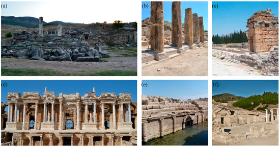 Some of the main monuments of Hierapolis: (a) The Apollo Sanctuary, Building A; (b) the Stoa of the Springs; (c) Nymphaeum of the Tritons; (d) the Theatre; (e) the Ploutonion; and (f) Church of St. Philip.