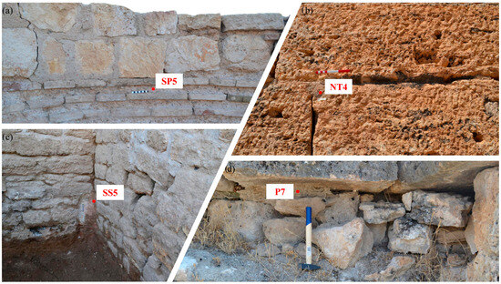 Some examples of (a) bedding mortar (SP5 sample—Church of St. Philip); (b) grouting mortar (NT4 sample—Nymphaeum of the Tritons); (c) coating mortar (SS5—Stoa of the Springs); and (d) concrete fill (P7 sample—Ploutonion).