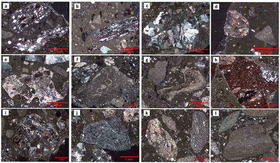 Microphotographs of most common aggregate in analyzed mortars (crossed polarized nicols): (a) TH2 gneiss; (b) SS7 meta-sandstone and schist; (c) SS6 calc-schist and quartzite; (d) SA-C1 amphibolite; (e) TH2 breccias; (f) P6 fossiliferous limestone; (g) P1 on the left micritic limestone and on the right travertine; (h) SS5 crushed ceramic fragment; (i) SA-A2 gabbro-like igneous rock; (j) SA-A1 serpentine fragment; (k) SS6 marble on the left and schist on the right; (l) P6 phyllite with schists.