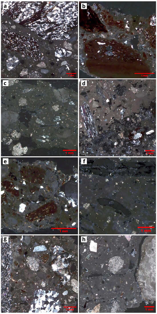 The binders of Roman bedding mortars predominantly exhibit a non-homogeneous appearance, while the Byzantine bedding mortars have a more homogeneous aspect. Textures ranging from micritic to microsparitic (e.g., P1, P2 and SA-C1) (Figure 5a,b,d) are observed for Roman and Byzantine ones. Some samples show partial recrystallization (e.g., SA-A4 and SA-C2) (Figure 5c). The analysis of lumps referred to underburned fragments of stone used for the production of lime suggests that binders were produced by burning travertines (Figure 5e,f) (e.g., P2, P3, TH1 and GB2) and marbles for Roman bedding mortars (Figure 5g,h) (e.g., P1, GB1 and SA-A3). For Byzantine bedding mortars, underburned fragments of marble are more common (e.g., SP16, SP7, SP1, SP2, SP8, SP4 and SP6).