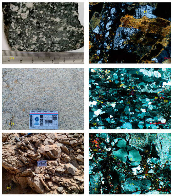 Biotite monzogranite is massive and heterogranular texture. It comprises 45% plagioclase, 25% alkali feldspar, 22% quartz, and 8% biotite, with minor additions of apatite and opaque minerals. The plagioclase crystals are tabular or granular, with grain sizes ranging up to 5 mm. The crystals are commonly sericitized and epidotized to varying degrees. The alkaline feldspars are mainly microcline and up to 4 mm in size. Quartz crystals are mostly granular and up to 3.2 mm in size and commonly exhibit wavy or zonal extinction. Biotite is mostly lamellar and commonly replaced by chlorite and epidote. The accessory mineral apatite is columnar or finely granular (Figure 2e,f).