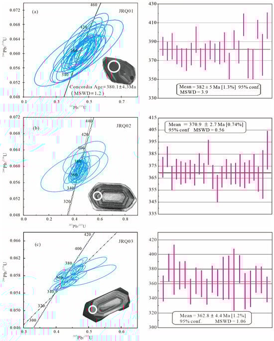 The zircons in biotite monzogranite (sample JRQ03) measure 80–210 μm in length, with length-to-width ratios ranging from 1:1 to 1:4. They are transparent euhedral crystals exhibiting typical magmatic oscillatory zoning. We determined U–Pb isotopic ages for 20 zircons (Table S3). The U and Th contents of these zircons are relatively high and highly variable, with U, Th, and Th/U ratios ranging from 63.76 to 584.52 ppm, 41.59 to 405.81 ppm, and 0.47 to 0.84, respectively, indicating that the studied zircons are typical magmatic zircons. The 206Pb/238U ages of 20 spots are concentrated within the range of 382–349 Ma, with a weighted average age of 362.8 ± 4.4 Ma (MSWD = 1.06) (Figure 3c), further indicating that the biotite monzogranite emplacement age is Late Devonian.