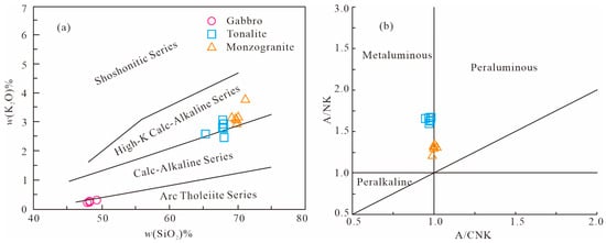 Major-element classification of Devonian magmatic rocks: (a) SiO2– K2O diagram []; (b) A/CNK–A/NK diagram [].