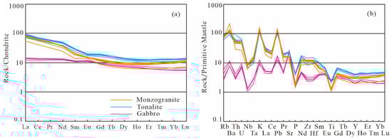 Chondrite-normalized rare-earth element (REE) patterns (a) and primitive mantle-normalized trace-element patterns (b) for gabbro, tonalite, and biotite monzogranite [].