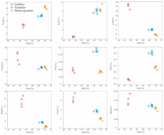 In the Harker diagrams (Figure 6), the correlation between SiO2 and other common elements in gabbro, tonalite, and biotite monzogranite is generally weak, indicating non-cogenetic magmatic affinity characteristics []. This suite of rocks likely represents distinct parental magma products from the same tectonic period.