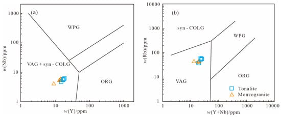 Incompatible trace element patterns (Figure 5b) show that the studied magmatic rocks are relatively enriched in light rare-earth elements (LREEs) and LILEs (e.g., Rb, Ba, and K) and depleted in HREEs and HFSEs (e.g., Ta, Nb, and Ti). Such features are characteristic of subduction-related magmas, whereas the very low LILE concentrations in gabbros are perhaps indicative of fore- or island-arc magmas [,,]. However, such geochemical characteristics can also arise via mantle-derived rock crustal contamination [,]. In the Nb–Y and Rb–(Y + Nb) diagram (Figure 7), the samples of the studied granitic rocks fall into the VAG region.