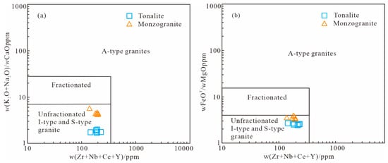 Rock-type discrimination for Late Devonian granite: (a) (K2O + Na2O)/CaO vs. (Zr + Nb + Ce + Y) diagram; (b) FeOT/MgO vs. (Zr + Nb + Ce + Y) diagram [].