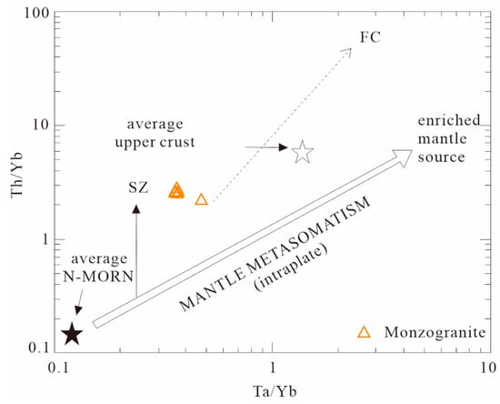 In the Th/Yb and Ta/Yb diagram [] (Figure 9), all samples are near the crustal area. The flat medium to heavy rare-earth element (M–HREE) patterns show that they were not formed by melting in the presence of garnet. The whole-rock geochemical composition diagram (Figure 10) shows that all biotite monzogranite samples are within the metabasalt area, suggesting their magma primarily resulted from partial metabasalt melting. Metabasalt has a higher Mg content than meta-andesite. If biotite monzogranites are derived from partial metabasalt melting, this would have occurred above the garnet-stable region (<10 kb) [,].