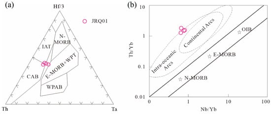 Tectonic setting discrimination diagrams from Jingerquan gabbro: (a) Hf/3-Th-Ta [] and (b) Th/Yb-Nb/Yb []. IAT, island arc tholeiitic basalt; CAB, continental-arc basalt; WPAB, within-plate alkaline basalt; WPT, within-plate basalt; N-MORB, normal mid-ridge basalt; E-MORB, enriched mid-ridge basalt; OIB, oceanic island basalt.