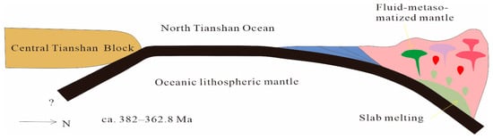 Within the Tianshan Orogenic Belt, limited studies have reported Late Devonian magmatic rocks. Some researchers suggest that the Late Devonian magmatic activity was associated with an oceanic slab subduction setting [,,,], while others propose that the Late Devonian intrusions formed during a collisional orogenic stage, as suggested by Gao Jinggang et al. [].