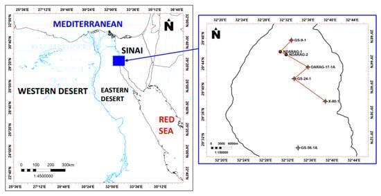 The main goal of this investigation is the assessment of Abu Darag sub-basin’s hydrocarbon potential, which is situated in the area with geographical coordinates of approximately latitudes 29°32′ to 29°48′ and longitudes 32°20′ to 32°44′ (Figure 1).