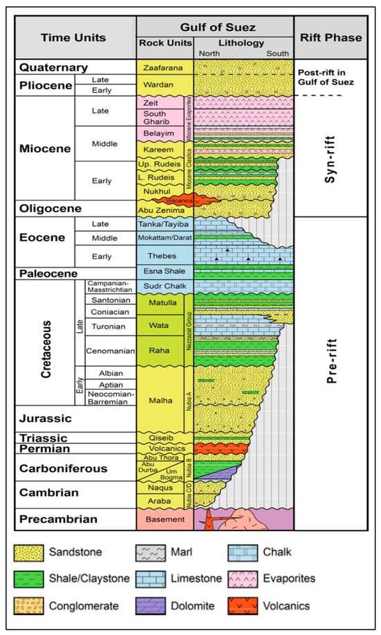 The early phases of the region’s rifting are represented by the red beds of the Abu Zenima Formation and Early Rift Volcanics (Figure 3). The Abu Zenima Formation is geographically localized around the Abu Zenima area on the eastern border of the Suez Rift [] and is not reported in the studied wells.
