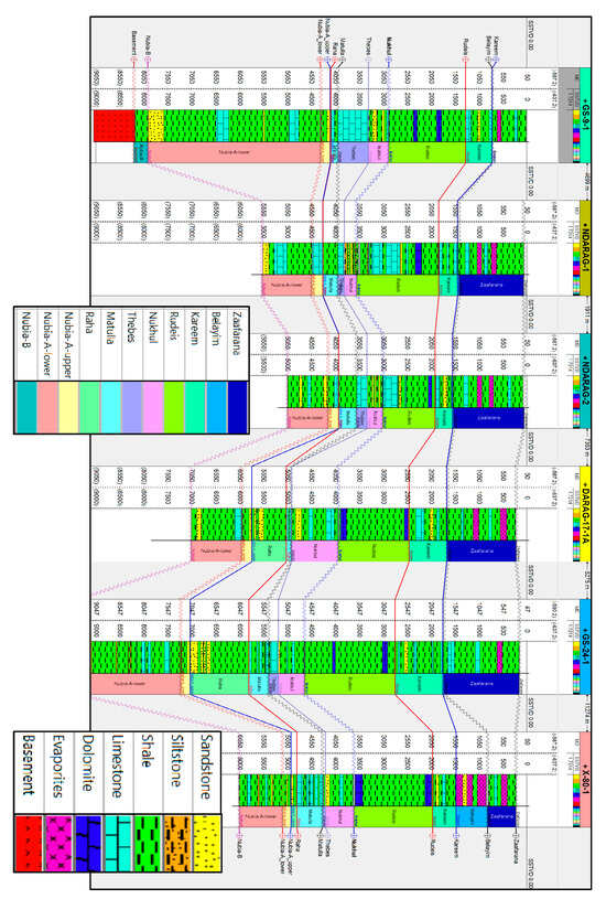 In the Permo–Carboniferous Nubia-B Formation, shale is the predominating lithology, encountered only in the GS-9-1 well in the northern part of the study area. The Jurassic–Early Cretaceous Nubia-A Formation is characterized by a thick lower part (approximately 1000–2000 ft) comprising shale with sandstone and limestone intercalations, and a thin upper part (approximately 100–200 ft) with shale and limestone intercalations. The Nubia-A Formation is separated from the Nubia-B Formation by a significant unconformity due to Triassic regional uplift (Figure 3). This unconformity can be detected in the GS-9-1 well only where the Jurassic Nubia-A Formation lies unconformably on the Carboniferous Nubia-B Formation.