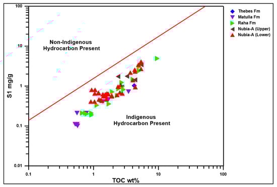 To assess the hydrocarbon potential of the Thebes, the Matulla, and Raha formations, and the Nubia-A Upper and Nubia-A Lower Members a number of geochemical parameters were used, as the use of TOC alone is unreliable when evaluating mature and over mature source rocks where TOC reflects the quantity of the residual (non-generating) organic matter, not the quality []. The 69 samples from the GS-24-1 well that were analyzed (Table 1) indicated that the sedimentary section contains source rocks with fair to excellent potential based on TOC values of 0.52 wt%–5.47 wt% and using the cut-off values of []. All samples from the Thebes, Matulla, and Raha formations and from the Nubia-A (Upper) and Nubia-A (Lower) members are plotted in the indigenous hydrocarbon zone (Figure 4).