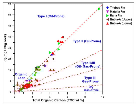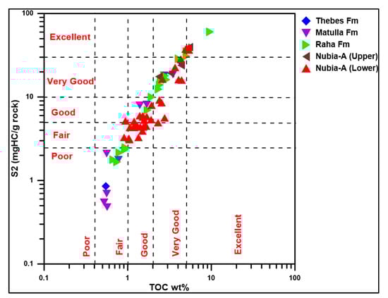 The quantity of the organic material increased from the Thebes Formation to the Nubia-A (Lower) Member where the TOC and S2 parameters indicate that the Thebes samples (TOC of 0.5 wt%–4.2 wt%, S2 of 0.8–27.1 mg/g) and Matulla (TOC of 0.5 wt%–3.4 wt%, S2 0.4–18.7 mg/g) have fair to very good source rock potential [] (Figure 5).