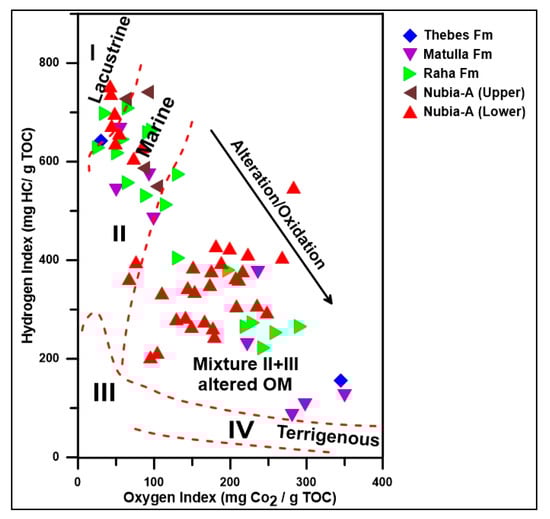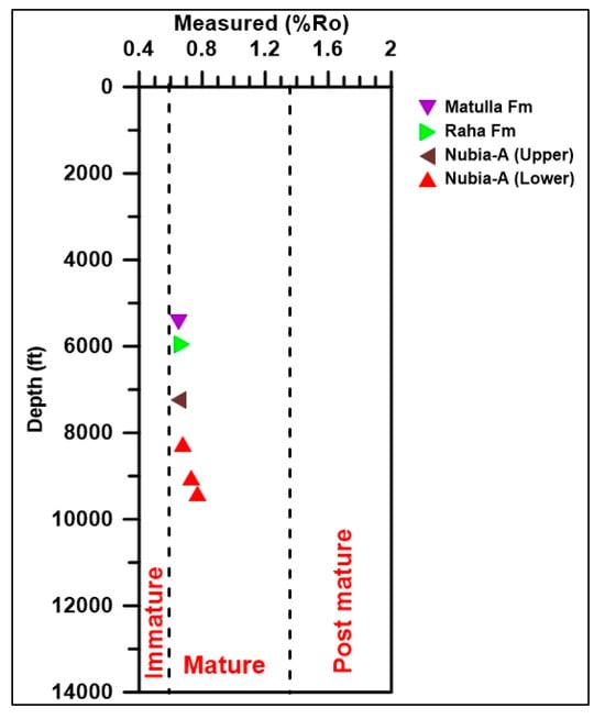 According to the plots of [] and the hydrogen index values [], the Thebes (HI: 156–642 mg HC/g TOC) and the Matulla (HI: 84–665 mg HC/g TOC) formations contain source rocks rich in kerogen Type II (oil-prone) and mixed Type II/III) (oil/gas prone) (Figure 7). The Raha Formation (HI: 223–698 mg HC/g TOC), the Nubia-A (Upper) Member (HI: 550–741 mg HC/g TOC), and the Nubia-A (Lower) Member (HI: 204–753 mg HC/g TOC) are oil-prone (contain Type I and Type II kerogen) and mixed oil/gas (contain Type II/III kerogen) (Figure 7).