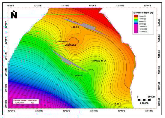 The early oil window (Ro% 0.55%–0.75%) is located in the northwest and southeast of the study area at depths between 3000 and 5000 ft. In general, the maturity of the Jurassic Nubia-A Lower Member increases toward the GS-24-1 well, which is located in the deeper part of the study area, and decreases toward the northwest and southeast. The transformation ratio, which is a quantitative change in the original organic material based on the total organic carbon and the hydrogen index in the source rock, represents the formation of hydrocarbons. The transformation ratio (TR) of the active hydrocarbon kitchen is greater than 20% []. The computed transformation ratio map shows that the active hydrocarbon kitchen occupies most of the area at depth below 5500 ft, and the northwestern part of the study area is inactive (TR is <10%), while hydrocarbon generation increases to the middle of the Abu Darag sub-basin where TR is >60% (Figure 17).