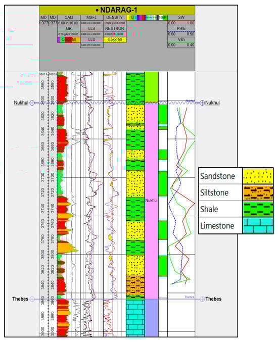 The Upper Cretaceous marine sequence consists of the Coniacian–Santonian Matulla Formation, the Turonian Wata Formation, and the Cenomanian Raha Formation. The Raha Formation is made up of calcareous shale, thin limestone intercalations, and fine-grained pyritic and glauconitic sandstone. The Wata Formation features interspersed sandstone and shale strata with extensive sequences of fossiliferous dolomite and limestone. The Matulla Formation includes lower fluvial-marine sandstone and upper shale units [], with a thickness of 100 to 500 ft, found in the studied wells. The lower Eocene Thebes Formation unconformably overlies the Matulla Formation, where the Campanian-Maastrichtian Sudr Chalk and Paleocene to Early Eocene Esna Shale are completely absent (Figure 3) due to tectonic uplift and the effects of the Syrian Arc System swell [].