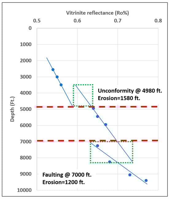 An increase in temperature in response to geothermal gradient results in an increase in vitrinite reflectance (Ro%) with depth, thus an increase in thermal maturity. Both the vitrinite reflectance and geothermal gradient values should show a gradual increase with depth and burial, unless the vitrinite reflectance values are affected by uplift and erosion []. The basin model shows the effect of erosion in the Cretaceous and Oligocene times, and the Dow method [] was used here to estimate the amount of erosion using the vitrinite reflectance data. Dow [] developed a method using a linear depth-versus-vitrinite reflectance plot to calculate the thickness of a missed section when this linear relationship is affected by unconformity, faulting, or volcanic influence. The depth-versus-vitrinite reflectance plot of the GS-24-1 well showed two missing sections (Figure 11). The first missing section is due to faulting and equals 1200 ft in thickness at 7000 ft depth. It is related to faulting and uplifting by the end of the Early Cretaceous. The second missing section is due to erosion and equals 1580 ft in thickness at 4900 ft depth. It is related to uplifting and erosion in the Oligocene, where the Abu Zenima Formation is absent. Other unconformities were detected by means of paleontology [] and well correlation, i.e., Esna Shale and Belayim formations are absent in the Abu Darag sub-basin while they are present in the Central GOS [,]. According to Dow [], in maturity profiles in faulted geological settings, the vertical displacements can be calculated by projection as unconformities. In the case of the GS-24-1 maturity profile (Figure 11), there are no rocks having higher maturity present on top of rocks having lower maturity. The maturity increases with depth from 5000 to ~10,000 feet, offsetting the maturity profile because of faulting. Faulting, and probable uplift of the faulted blocks followed by erosion, could be the cause of this maturity profile offsetting.