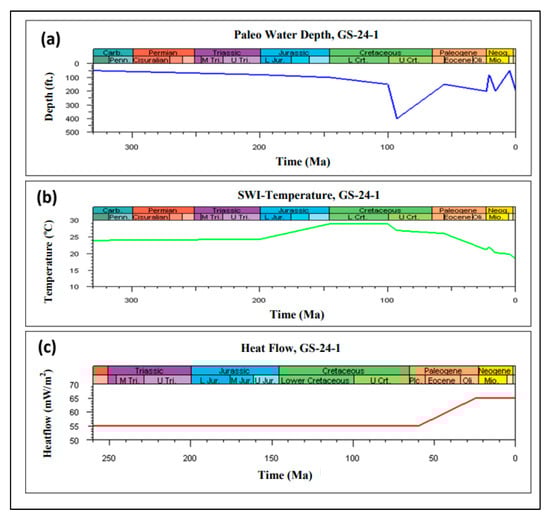 The temperature of the sediment–water interface at the top and the paleo-heat flow at the bottom are the boundary conditions required to build a 1D basin model [,]. Based on the paleontological and foraminiferal analysis of ditch samples for the GS-24-1 well, an approximate paleowater depth has been determined []. Paleolatitude and water depth, which are synthesized, affect the temperature at the sediment–water interface [].
