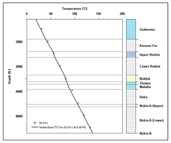 The burial history model of the GS-24-1 well was constructed by the Petromod 1D IES software (2007) using the vitrinite reflectance cracking method of []. This method is commonly used in petroleum geology to simulate the thermal maturation of organic matter in sedimentary basins over geological time scales. It helps to understand the generation and migration of hydrocarbons in the subsurface. Vitrinite reflectance was calculated using EASY %Ro method (simplified Vitrinite method). The model (Figure 15) shows gradual subsidence and deposition of the Abu Darag sub-basin from the end of the Paleozoic until the end of Early Cretaceous (260–110 Ma). During the Late Cretaceous (110–100 Ma), the basin was subjected to a major uplift, followed by erosion. By the end of the Cretaceous (95–66 Ma), the basin continued to subside. The Esna shale of the Paleocene age (66–56 Ma) is absent due to uplift and erosion as evident from paleontology and lithological description in the GS-24-1 well. A thick accumulation of fluvial and fluvio-marine deposits took place during the Eocene (56–33 Ma), which coincided with the syn-rift phase of the GOS’s geologic history. The Oligocene Abu Zenima Formation is absent due to uplift caused by tectonic movements (~33–23 Ma). Throughout the Miocene, rifting persisted, resulting in the deposition of the limestone, sandstone, and shale of the Rudeis, Kareem, and Nukhul formations (~23–11 Ma). By the end of the Miocene (~11–5 Ma), a minor uplift caused the erosion of the Belayim, South Gharib, and Zeit evaporites.