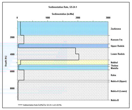 The accumulation of sediments in a basin is the result of the interaction of subsidence rate, sediment influx, and the height of the water column [,]. The sedimentation rate may be computed by measuring the amount of sedimentary succession that accumulated over time, and periods of erosion or non-deposition are also included. The sedimentation rate models of the GS-24-1 well (Figure 14) show that the first sequence was initiated by the deposition of Paleozoic clastics on the Precambrian basement with the lowest sedimentation rate (~2 m/Ma or ~7 ft/Ma) during the deposition of the Nubia-A and Nubia-B formations in the Abu Darag sub-basin. This is because the rate of deposition is low where tectonic subsidence rate is low, and sediment influx is also low.