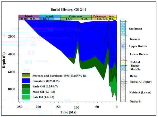 Later, nonmarine sandstone and shale deposits filled these grabens during the Early Cretaceous. At this time, normal faults persisted, leading the graben system to progressively sink and form a deep basin. Mesozoic and Paleogene strata were deformed by significant tectonic compression in the Late Miocene–Pliocene time, where a sequence of folds developed in regions impacted by tectonic compression []. The modeling of the Abu Darag sub-basin was performed by constructing a 1D model for the GS-24-1 well. The 1D model demonstrates the subsidence history, sedimentation rates, maturation history, and starting time and development of hydrocarbon generation at the well location and provides valuable information about the basin’s history [].