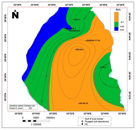 Vitrinite reflectance (VRo%) map of Nubia-A Lower Member. Contour lines in feet.