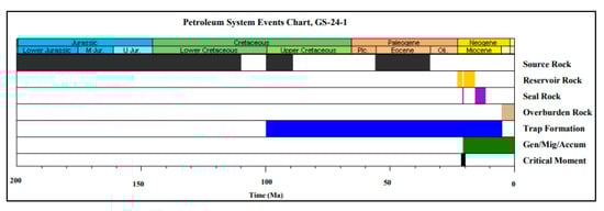 A petroleum system includes all elements of petroleum generation and accumulation in a basin []. These components include geological formations that create petroleum traps, such as source, reservoir, and seal rocks, as well as impermeable faults that act as seals for the movement of hydrocarbons, and permeable faults which act as migration pathways for hydrocarbons. The petroleum system events chart for the Abu Darag sub-basin is shown in Figure 18. It is based on the GS-24-1 well and includes all elements of a petroleum system. The timing of these elements is important for the entrapment of the generated hydrocarbons. The probable shale source rocks were deposited from the Jurassic to the Eocene throughout the geologic history of the basin and only the Nubia-A Lower Member is proved to be the effective source rock in the basin according to its organic geochemical data. The sandstone reservoir rocks of the Nukhul and Rudeis formations were deposited during the Miocene (23–5.3 Ma). Oil generation, migration, and accumulation began in the Late Oligocene (~22 Ma). The structural traps evolved during the period from Late Cretaceous to Late Miocene (100–15 Ma). Those traps were later charged by hydrocarbons through migration and accumulation, which is characteristic of all the northern Gulf of Suez sub-basins in Egypt. Migration could occur when hydrocarbons move directly from the low permeable source rock to the permeable reservoir upon generation and expulsion []. Migration could also be secondary and vertical along fault planes or lateral by up-dip migration and fault juxtaposition [].