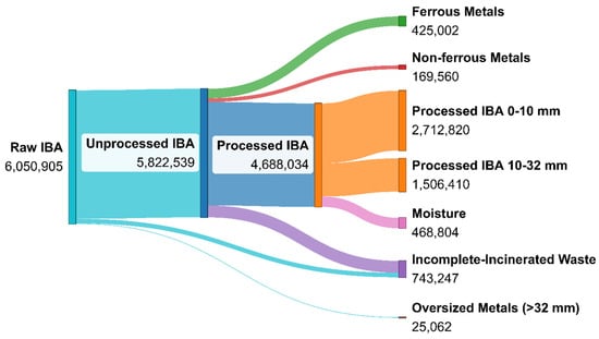 The main challenge in adding value and utilizing IBA at the industrial scale is its characteristics as a highly heterogeneous material, including a relatively high concentration of contaminants []. Although IBA has been proven to contain a significant amount of minerals, its application in the construction sector is limited by the behavior of those undesired impurities that can degrade product quality and threaten the environment. On the other hand, solely depending on metal recovery is also considered not economically feasible [], given the exponential counterproductive expansion in resulting cost as the recycling rate increases []. Therefore, a synergy is necessary to combine all available alternatives to generate various streams of valorization for each fraction from IBA.