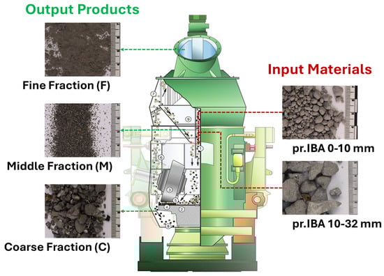 Schematic of the LOESCHE demonstration-scale vertical roller mill [] used for selective milling of pr.IBA with a representation of input materials and output products.